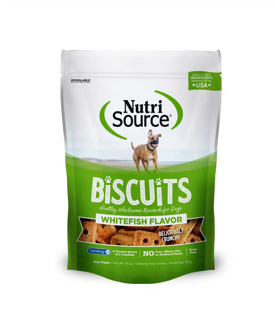 Características: Las golosinas para perros NutriSource Grain-Free Fish Biscuits incluyen pescado blanco real como primer ingrediente y están hechas con frutas y verduras reales. Esta receta rica en carne y rica en proteínas seguramente será un éxito para su perro.