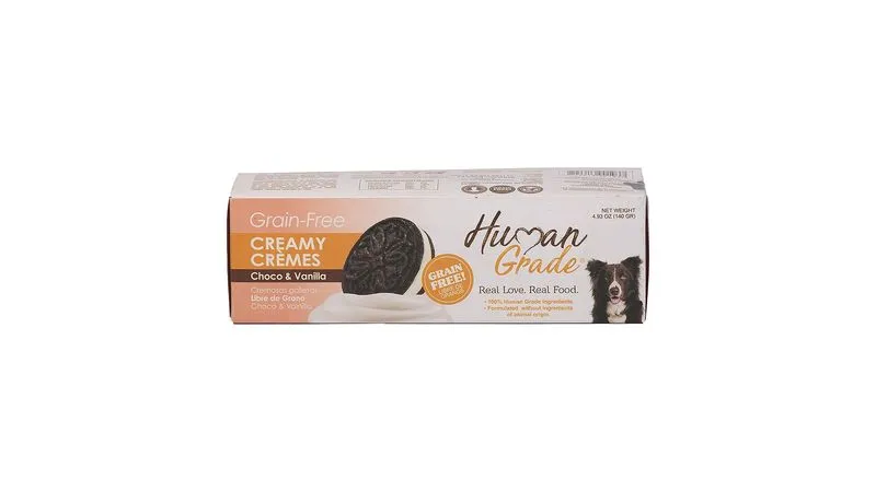 Características: HUMAN GRADE CREAMY CREMES CHOCO-VAINILLA. GALLETAS RELLENAS SÚPER PREMIUM, PARA PERROS DE TODAS LAS RAZAS.¡DOBLEMENTE ESPECIALES! Libres de grano y con relleno extra cremoso, irresistible al paladar de tu perro.