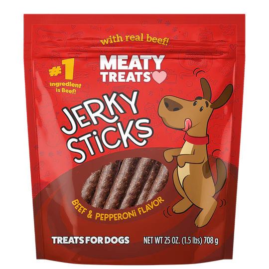 Características: Meaty Treats Jerky Sticks son un delicioso aperitivo entre comidas que a tu perro le encantará. Debido a que nos preocupamos por la calidad de nuestras golosinas para mascotas, elegimos usar carne de res real en esta formulación única. Este sabroso aperitivo tiene una atractiva forma de STICK o palito y una textura masticable que atraerá a tu perro a querer más. Además, el sabor a carne crea un aroma delicioso que tu perro encontrará irresistible.