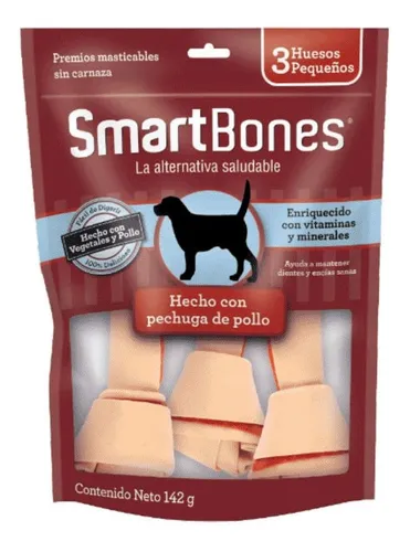 Características: Tu perro no podrá resistirse al exquisito sabor de los snacks premium Smartbones Chicken Small. Están fabricados con vegetales y tienen una capa interna de pollo que alegrará los días de tu gran amigo perruno. Pequeñas dosis de una golosina que tu perro no va a querer que se acabe nunca. Smartbones es una alternativa saludable, diferente a la carnaza, y a tu perro le encantará. Hecho con pollo y verduras reales.